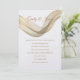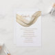 Diese Hochzeitseinladung wird in einem klassischen Layout auf weißem Hintergrund gezeigt, das in einem Papier mit Peal Shimmer Papier gezeigt wird. Wählen Sie Ihr Wunschpapier aus. Grafik des goldfarbenen Schleiers, der über die obere Vorderseite gezogen wurde. Coupels Namen vermischen sich mit der Schleiergrafik in goldener Farbe oben. Text in goldener Farbe unter dem Schleierdrape. Passen Sie dieses Element an, indem Sie den Beispieltext nehmen und stattdessen Ihre Informationen darin einfügen.