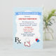 Die ärztliche Verschreibung für den Ruhestand ist eine blaue Einladung mit einem Stethoskop, einem RX-Symbol und roten, weißen und blauen Tabletten.