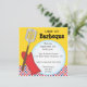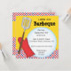 Diese barbeque Einladung in leuchtenden Farben hat einen gelben Hintergrund mit einem Streifen von roten Karos auf der Unterseite. Auf der links Seite befinden sich ein roter Ofen-Mitt und eine Spatula-Grafik, wobei sich ein großer weißer Kreis für den Text öffnet. Diese Einladung kann für jede Art von Grill oder Cookout angepasst werden.