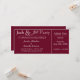Tief, kranberry rot für Jack und Jill Polterabend Party. Die links Seite der Einladung hat einen Platz für die Namen von Braut und Bräuchen und den Veranstaltungsort. Passen Sie Ihre eigenen Formulierungen und Informationen an. Die rechte Seite der Einladung wird mit einer gepunkteten Linie abgeschnitten und als Ticketstube für den bezahlten Eintritt ins Party verwendet. Passen Sie sich mit Ihrem eigenen Preis, Datum und Uhrzeit an. Dies ist eine perfekte Einladung, als Ticket zu bezahlten Jack und Jill Polterabend Party!