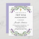 Weiß mit Lavendel-Blume und Eukalyptusgrün dekoriert. Personalisieren und einen Namen und Details. Zurück: Lavendel, violetter Hintergrund. 1 Blatt = 1 Einladung