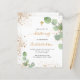 Weißer Hintergrund mit Eukalyptusgrün und Imitaten goldener Glitzer Staub. Personalisieren und die Kinder Name und Zeremonie Details. Schwarze und goldfarbene Buchstaben. Geschlechterneutral. Zurück: weißer Hintergrund mit goldenen Imitaten Glitzer Staub.