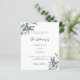 Ein stilvoller weißer Hintergrund auf der Vorderseite. Mit Eukalyptus und Lavendel-Blumen dekoriert. Personalisieren Sie Ihre Namen und Details und fügen Sie diese hinzu. Zurück: grüner grauer Hintergrund.