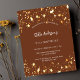 Brauner Hintergrund mit goldenen Sternen. Personalisieren und fügen Sie einen Namen und Party-Details hinzu. Der Name wird mit einem handgeschriebenen Stilskript geschrieben, mit weißen, farbigen Buchstaben. 1 Blatt = 1 Einladung mit Druckkante bis Kante.
