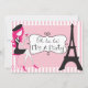 Paris Thema Geburtstag Einladung mit einer Frau, die Wein verkosten. Vorder- und Rückseite mit rosa Streifen und einer Grafik des Eiffelturms, die von Prettygrafik aus in die Höhe ragt
