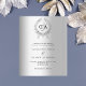 Ein Imitat silber aussehender Hintergrund und ein Kranz. Personalisieren Sie Ihre Monogramm-Initialen, Namen und Details und fügen Sie diese hinzu. Schwarzer Text. 1 Blatt = 1 Einladung mit Druckkante bis Kante.