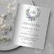Ein Imitat silber aussehender Hintergrund. Ein Blumenkranz aus Lavendel-Blume und einem Aquarell aus Eukalyptusgrün. Personalisieren Sie Ihre Monogramm-Initialen, Namen und Details und fügen Sie diese hinzu. Schwarzer Text. 1 Blatt = 1 Einladung mit Druckkante bis Kante.