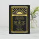 Diese Einladung zur Verlängerung des Hochzeitgeliebtes in den 20er Jahren ist ein Art Deko Design mit einem goldenen Sonnenburstmuster, das den Fokus auf einer Goldband bildet. Alle Details zur Verlängerung des Geldes erscheinen unten mit den kunstvollen Deko-Details rund um die Uhr auf schwarz. Das ist eine wunderbare Schwarz-Gold-Jugendstil-Einladung oder eine rauschende 20er-Stileinladung für den perfekten Start zu einer Verheißungsfeier. Copyright henishouseuse paper