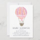 Feiern Sie Ihr kleines Mädchen unterwegs mit dieser schicken und einfachen Babydusche-Einladung in sanften Pastellfarben. Das Design zeigt eine Heißluftballon-Abbildung in Pfirsich und Rosa, darunter Ihre Veranstaltungsdetails in rauchblau-graue Schrift.