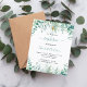 Weiß mit Farnen und Eukalyptusgrün. Ein goldenes Kreuz. Der Name ist mit einem modernen handgeschriebenen Stilskript geschrieben. Personalisieren und fügen Sie Namensdetails hinzu. Schwarzer und grüner Text.