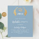 Ein staubblauer Hintergrund. Ein klassisches Imitat mit Goldlachkranz und einem Graduierungsmütze. Personalisieren Sie das Jahr, den Namen und die Details. Weißer Text. 1 Blatt = 1 Einladung mit Druckkante bis Kante.