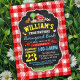 Hof Geburtstagseinladung mit roten karierten, roten Traktoren, einer Scheune und niedlichen Nutztieren, Pferd, Schwein, Kuh, Huhn und Ente. Diese Einladung ist perfekt für Jungen oder Mädchen Farm Thema Geburtstag Party.