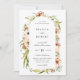 Elegante botanische Waldblüte, Einladung zur Hochzeit. Trendfarbener Bogenrahmen mit Aquarellfarben-Blume, Blattwerk, Kiefernzapfen und Waldbeeren, die sich durch die grüne Farbabdeckung abstimmen. Die Einladung bietet schicke Typografie Design Stil Mix aus Kalligraphie und fett-Typ.