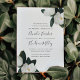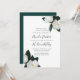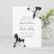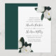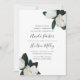 Elegante und anmutige blumengeschmückte Hochzeitseinladung mit schicken, weißen magnolischen Blume und dunkelgrünen Blätter an den Ecken, die Ihre Hochzeitsdetails in handgeschriebenen Schriften, Blockschrift und kursiven Schriften abstecken. Einladungen kehren zu sattem Grün zurück.
