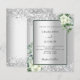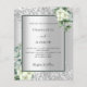Imitate silberfarbener Hintergrund mit weißen Blumen, Blume, Eukalyptusgrün und Imitaten silberne Glitzer, Glitzern. Personalisieren und fügen Sie Ihre Namen und Hochzeitsdetails. Schwarze Buchstaben.