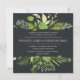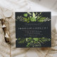Unsere Hochzeitseinladung Midnight Garden in einem einzigartigen quadratischen Format umrahmt Ihre Hochzeitsdetails mit einem oberen und unteren Rand von bemaltem Aquarell in üppigen Frühlingshönen, Oliven und Farn. Moderne, aber Bio Wahl für Frühjahr- oder Sommerhochzeiten mit frischen grünen Blätter in der Jahresfarbe 2017, Set vor einem eleganten, dunklen Hintergrund.
