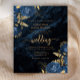 Diese elegante Hochzeitseinladung mit blauen Blumenbouquets Set mit vergoldeten Imitaten Folie in zwei Ecken, auf einem Hintergrund von marineblauen Aquarellbilder. Der anpassbare Text kombiniert goldfarbene Serif-, Kursivschrift- und Handschriftzeichen-Schriftart. Die Rückseite ist mit einem blauen und goldenen Blumenmuster und einem gelben Design ausgestattet.