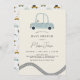 Die Babydusche lädt in minimalistischem Stil mit einem blauen Kleinwagen und dem Muster der Autos auf der Rückseite ein. Sie können diese Einladung mit Ihren eigenen Daten im Bereich "Personalisieren Sie diese Vorlage" personalisieren.