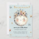 Eine Babydusche im himmlischen Stil, die mit einem blühenden Mond geschmückt ist und von niedlichen, fröhlichen Sternen umgeben ist. Der Text "We're Over the Moon!" vermittelt Aufregung für das kommende Baby. Die sanften Pastellfarben, die goldenen Akzente und das skurrile Design schaffen ein traumhaftes und herzliches Ambiente. Die Einladung enthält Veranstaltungsdetails wie Datum, Uhrzeit, Ort und Registrierungsinformationen, was sie schön und funktionell macht, um die zukünftigen Eltern zu feiern.