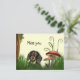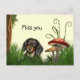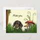 Die Dackel besteht aus schwarz-bräunlich langen Haaren und liegt zwischen den Gräsern und Pilzen und vermisst jemanden, der Postkarten liebt