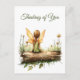 Eine einsame, junge Fee mit goldenen Flügeln, die ein grünes Kleid tragen und von Wildblumen umgeben sind, sitzt auf einem Stein und blickt in die Ferne.