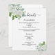 Eine moderne, elegante Hochzeitsdetails/Programm/Zeitleiste. Weiß, mit weißen, wasserfarbenen Blumen und Eukalyptusgrün dekoriert. Personalisieren und fügen Sie Ihre Namen und Hochzeitsdetails. Schwarze Buchstaben. Text auf beiden Seiten. 1 Blatt = 1 Programm, mit der Kante bis Kante bedruckt.