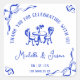 Einzigartiges, blau-weißes Handgemälde und handgeschriebener zeitgenössischer Retro Französischer Spaß Save the Date mit einem Bugrahmen, ein skurriles trendiges Kunstwerk für Ihre französische Hochzeit am Savanamm