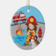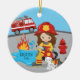 Niedliche Feuerwehrmann-Weihnachtsverzierung, die ein entzückendes brünettes Mädchen mit einem Feuer-LKW, Feuerhydranten u. einem Dalmatinerwelpen trägt einen Feuerhut kennzeichnet. Ein, um zu kommen jahrelang gehütet zu werden Wunder-Weihnachtsgeschenk sure.