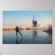 Plakatdruck einer sportlichen Eis-Skaten auf einem eingefrorenen Fluss vorbei an mattierten Schilfröten und einer Windmühle an einem schönen Wintermorgen in den Niederlanden.
