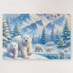 Eine friedliche Winterlandschaft mit Eisbären in einer verschneiten Landschaft. Im Vordergrund stehen zwei prominente Eisbären, eine sitzend und eine stehend, mit mehreren kleineren Eisbären im Hintergrund. Die Umgebung umfasst schneebedeckte Kiefernbäume, eine Gebirgskette unter einem Dämmerhimmel, Fliegenvögel und Enten im Wasser. Die detaillierte Darstellung von Natur und Wildnis schafft eine ruhige Atmosphäre.