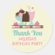 Ein Party danke Ihnen Aufkleber mit einem süßen Eis Thema. Illustriert mit einer Schokoladeneis-Bar, 3-Sundae mit Kirsche und Erdbeerfloat. Kleine Erdbeeren und Kirschen am Boden. Rosa und Braun.