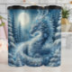 Ein majestätischer, weißer und eisblauer Drache mit detailreichen und leuchtenden blauen Erholungen in einem schneebedeckten Wald unter dem Licht eines großen Vollmonds und funkelnder Sterne. Schneebedeckte Kiefernbäume umgeben das prächtige Geschöpf und schaffen so eine zauberhafte Winterlandschaft.
