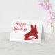 Senden Sie Ihre besten Wünsche an Spieler und Hockey-Fan mit einer Eishockey Weihnachtskarte. Vorderes Design: goldener Hintergrund mit Hockey-Skate im Roten Funkeln und "Happy Holidays" im Rot-Rücken-Design: Hockeyspieler im Roten Funkeln