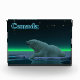 Ein friedlicher Moment in der langen arktischen Nacht. Ein Polarbär Erholungen am Rand eines offenen Bereichs im Packeis. Die Nordlichter leuchten in der Ferne; helle Sterne leuchten über dem Kopf. Text mit "Kanada" erscheint in leuchtendem Blau. Eisbären sind gefährdet. Wie lange werden solche Szenen noch stattfinden können? Helfen Sie bitte, Polarbären vom Aussterben retten.