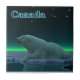 Ein friedlicher Moment in der langen arktischen Nacht. Ein Eisbär Erholungen am Rand eines offenen Bereichs im Packeis. Die Nordlichter leuchten in der Ferne; helle Sterne blinken über dem Kopf. Text mit "Kanada" erscheint in leuchtendem Blau. Eisbären sind gefährdet. Wie lange werden solche Szenen noch stattfinden können? Helfen Sie bitte, Polarbären vom Aussterben retten.