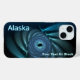 Ein blaues Fraktal-Bild, das einer wirbelnden Gruppe von Walen unter Polareis ähnelt; vielleicht Beluga- oder Minkwale, die die Pole häufen. Es erscheint auch das Textlesen "Alaska". Passen Sie Ihren eigenen Text an.