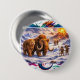 Rundes Abzeichen mit einem Wollmammut und Bären, während Fackelträger durch den Schnee unter einem ausbrechenden Vulkan gehen — kräftige Farben, Skizzenstil, geeignet für Jacken und Taschen.