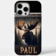 Ein großer Elch mit eindrucksvollen Geweihten wird auf einem Holzpaneel vor einem Wald und einem bewölkten Sonnenuntergang dargestellt. Der Name Paul ist in großer Schrift am Ende des Panels geschrieben.