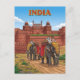 Zwei Elefanten mit Fahrern werden vor einer großen, historischen indischen Festung gesehen, die unter einem klaren blauen Himmel in Sonnenlicht badet.