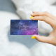 Diese Visitenkarte ist mit einem lila, künstlerischen Galaxiehintergrund und einem eleganten Schriftart mit Wimpern ausgestattet. Auf der anderen Seite gibt es einen QR-Code, der durch Ihren ersetzt werden soll. Standard-Größe , Girl-Visitenkarte für Ihre trendige, Space-Age-Stil-Werbeaktion .