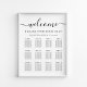 Elegantes Hochzeitsplakat für bis zu 12 Tische mit Begrüßung in einem stilvollen Drehbuch mit Swashes, "Find Your Seat", Ihren Namen und Hochzeitsdatum in eleganter Serif-Typografie und den Tischnummern und Gastnamen in schlichter moderner Typografie. Wählen Sie die Option zum digitalen Download, um Änderungen in letzter Minute zu bearbeiten und lokal auszudrucken.