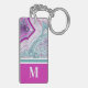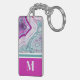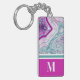 Élégant Turquoise Magenta Rose Agate Pierre Monogramme Porte - clé. Les cristaux d'agate et les géodes continuent d'être une tendance préférée! Cette impression présente et une image rapprochée d'une pierre géode rose ou fushia turquoise ou turquoise et violette, avec des petits cristaux et des bandes blanches. Accentué par un blocage coloré dynamique pour lui donner un look moderne et tendance. Ajoutez votre initiale pour en faire la vôtre.