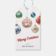 Frohe Weihnachtsgeschenke Anhänger. Das Design besticht durch eine Reihe von bunten, dekorativen Weihnachtsbaumklängen. Stellen Sie sich einfach Ihren Urlaubsgruß und Ihren Namen ein.