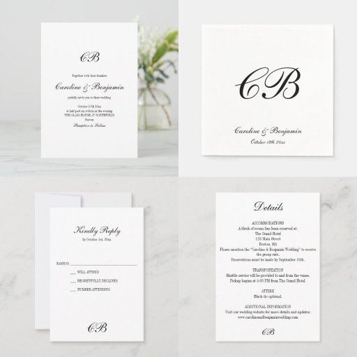 This wedding invitation features a traditional monogram with elegant script and serif typography for a timeless, black and white design. Personalized with your names, date, and venue, it sets a formal tone with simplicity and grace. A classic choice for black tie events, traditional ceremonies, and couples who love a refined, no-fuss aesthetic.