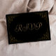 Cette élégante carte RSVP de mariage d'inspiration vintage présente du texte en écriture de couleur or sur un arrière - plan noir, encadré d'un délicat motif de vigne d'or vintage. Le titre "RSVP" apparaît d'un côté, avec du texte personnalisable de l'autre.
