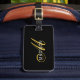 A simple stylish monogram luggage tag with a gold script initial over your name in white sans serif type. Contact information on the back.