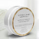 Un élégant étiquette de cosmétique avec un arrière - plan blanc, du texte noir et une fausse bordure en or.