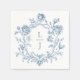 Elegant blue floral crest monogram wedding napkins featuring a delicate vintage botanical wreath surrounding a customizable monogram. Perfect for cocktail hour, wedding receptions, engagement parties, rehearsal dinners, and bridal showers.
