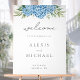 Modernes, elegantes Hochzeitswillkommensschild mit blauem Hydrangea Aquarell Blumendesign.