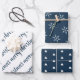 Ein elegantes Set von drei aufeinander abgestimmten Packpapierblättern in einer tiefblauen und elfenbeinfarbenen Palette. Man hat frohe Weihnachten in einem modernen, handgeschriebenen Schriftart geschrieben. Die zweite ist mit einem abstrakten Weihnachtsbaummuster versehen und die dritte Platte hat ein Schneeflockenmuster.